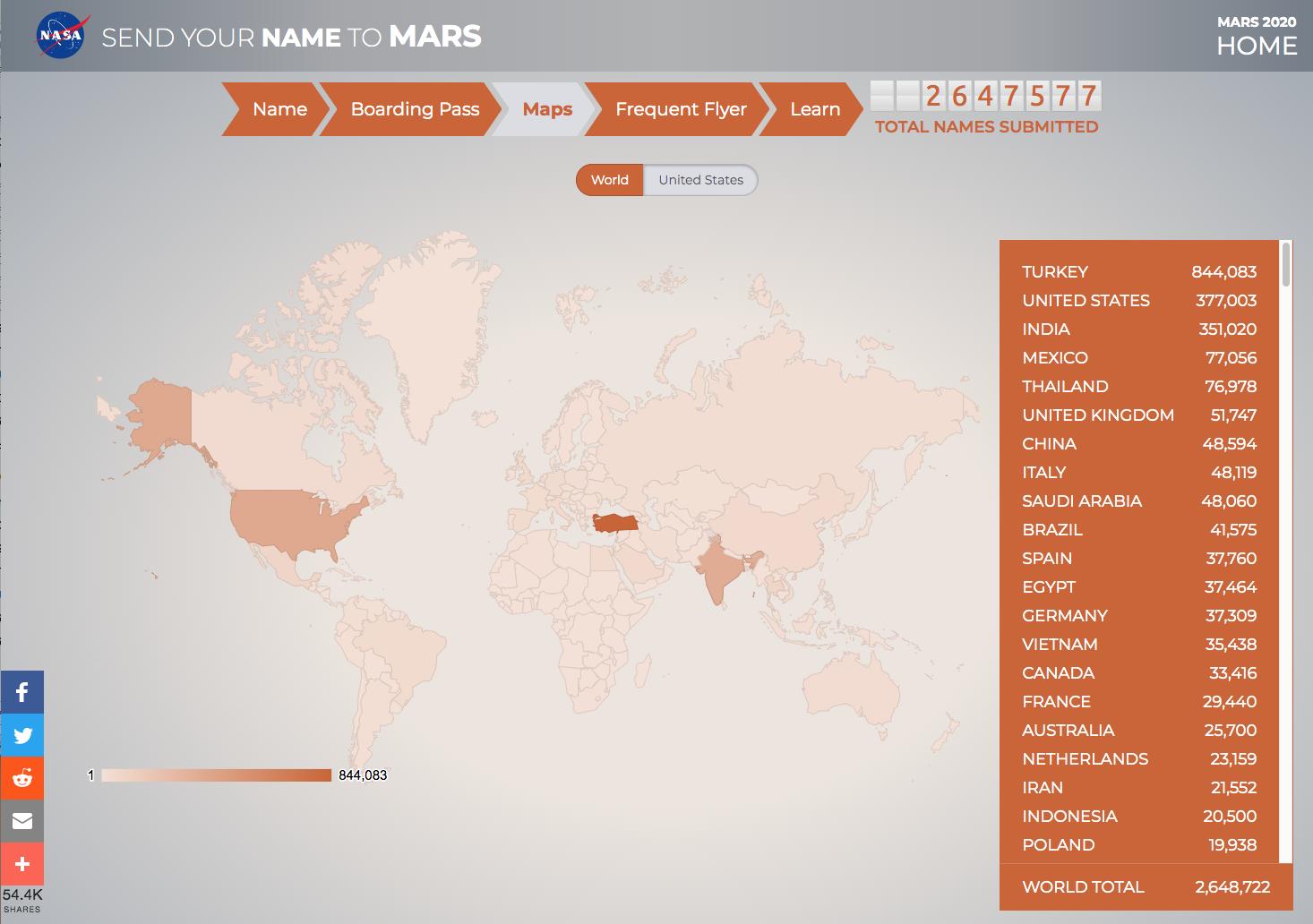 Nasa Jpl On Twitter In Fewer Than 48 Hours The World Sent In More Than 2 6 Million Names To Fly Aboard Mars2020 With Submissions From Turkey Leading The Way Thank You To